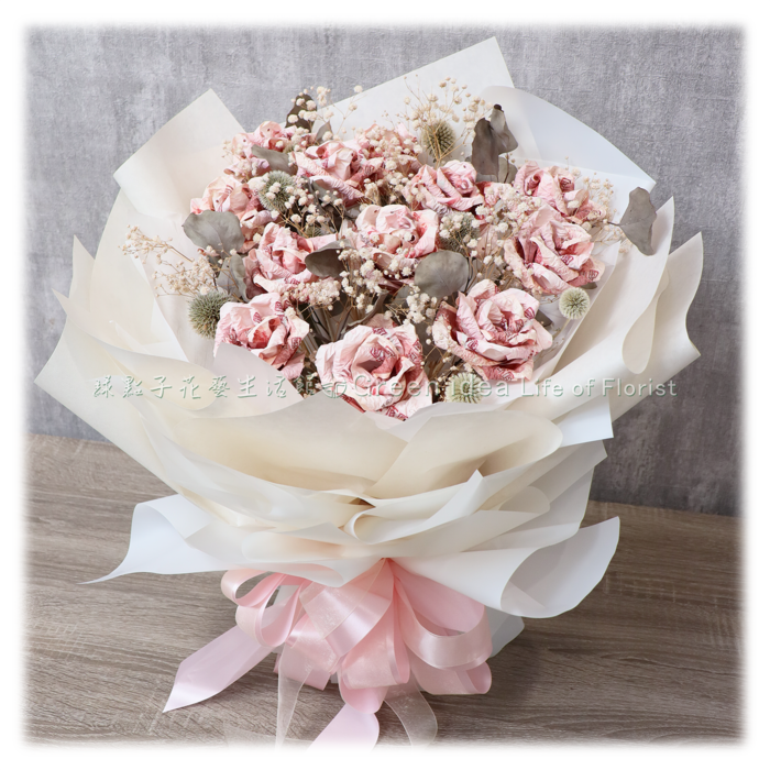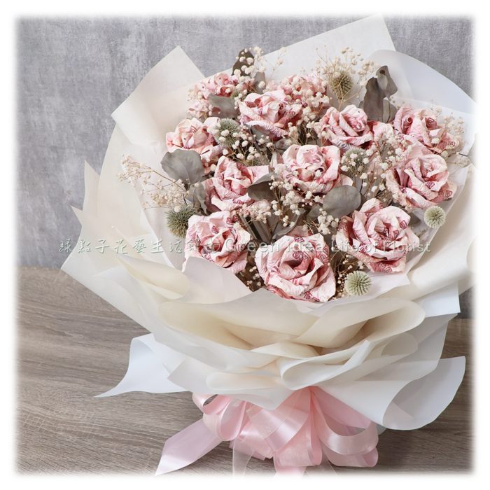 百元鈔60張、滿天星、乾燥花材。