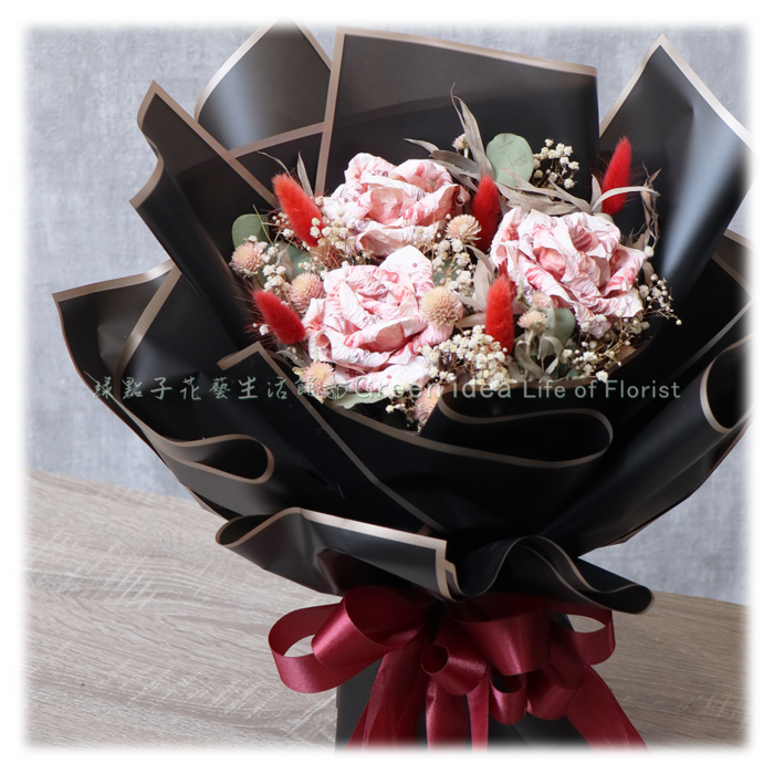 百元鈔15張、滿天星、乾燥花材。